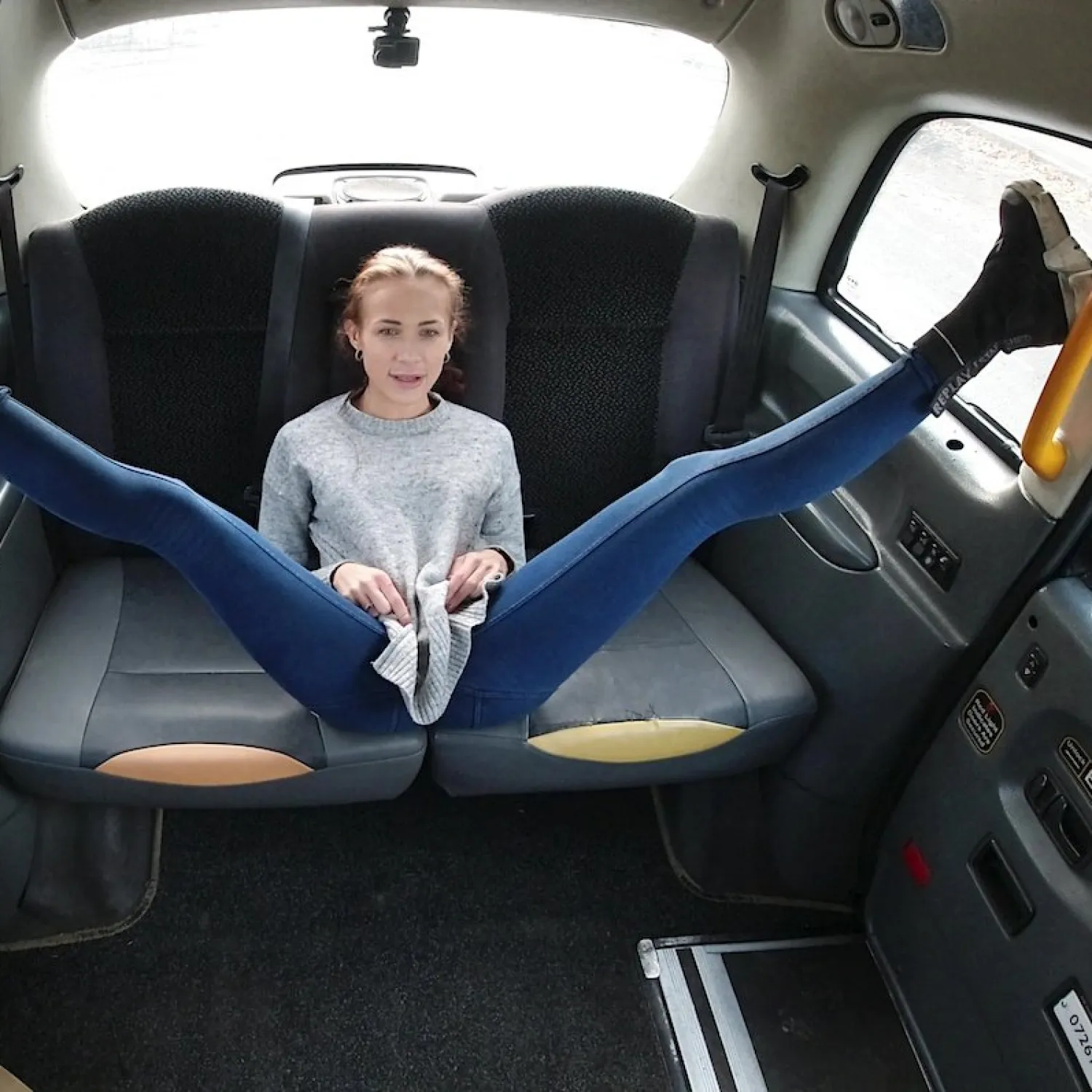 This beautiful skinny sexy brunette spread her legs so the horny taxi driver could taste her pussy. Next time they will continue the massage they started today.